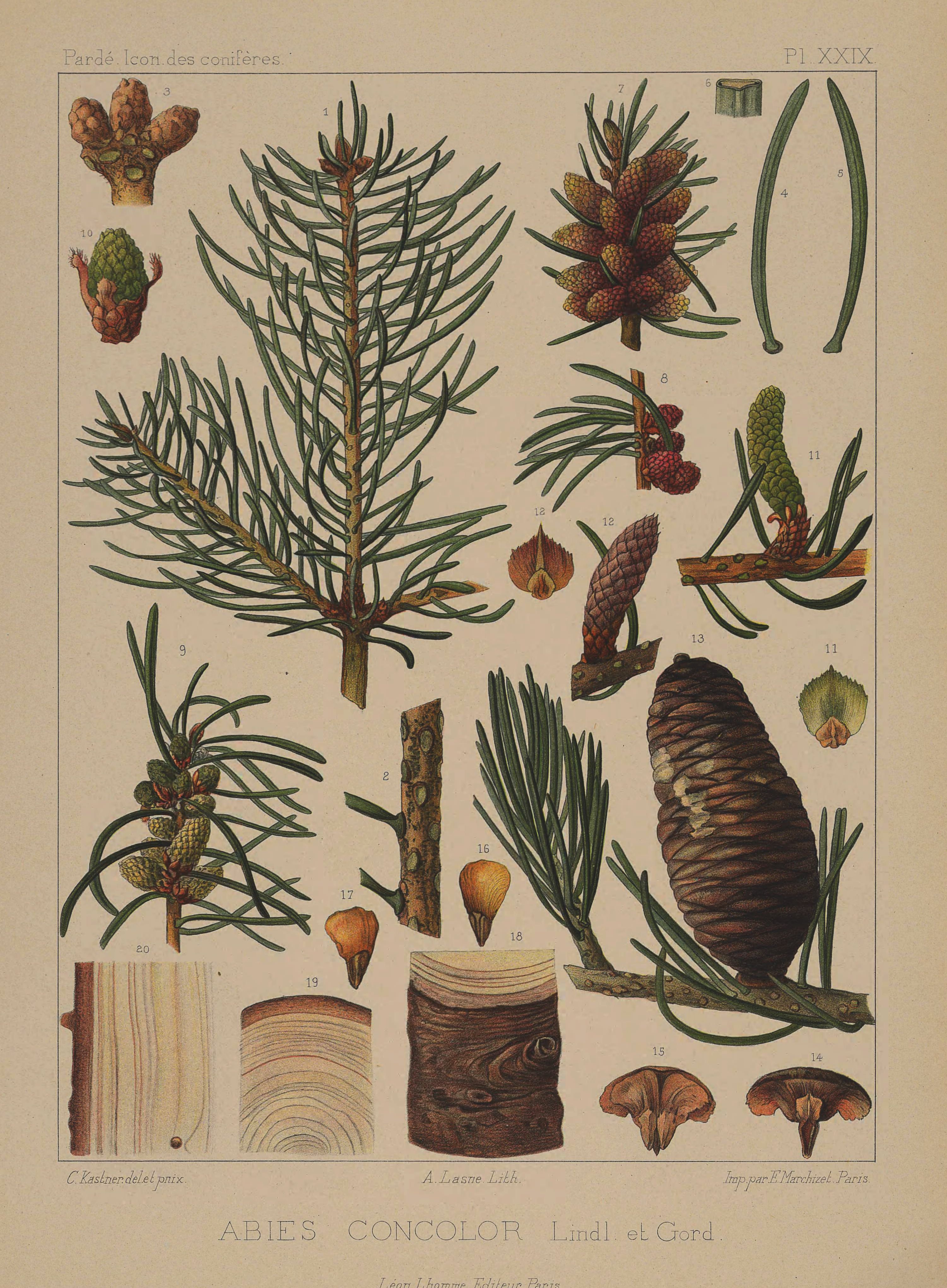 Abies concolor var. lowiana = Sierra / California white fir: nagyobb fa, kevésbé kékes, laposabban álló tűkkel, enyhébb, óceániasabb klímához adaptálva, kicsit „grandisos” jelleggel.