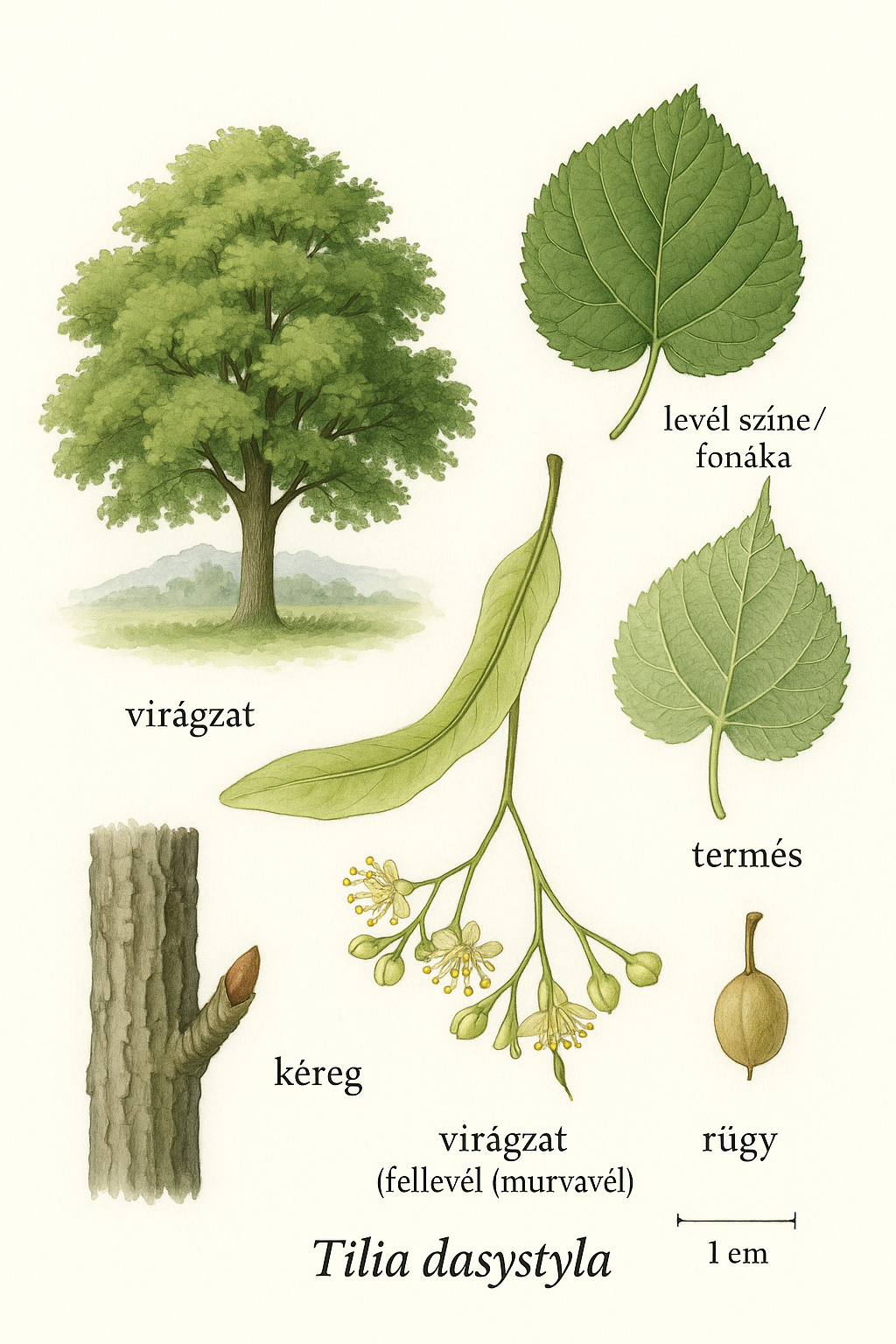 T. tomentosa (ezüst hárs): levélfonák egységesen ezüstös-molyhos → ez jól választja el a többnyire „nem ezüst” T. dasystyla-tól.