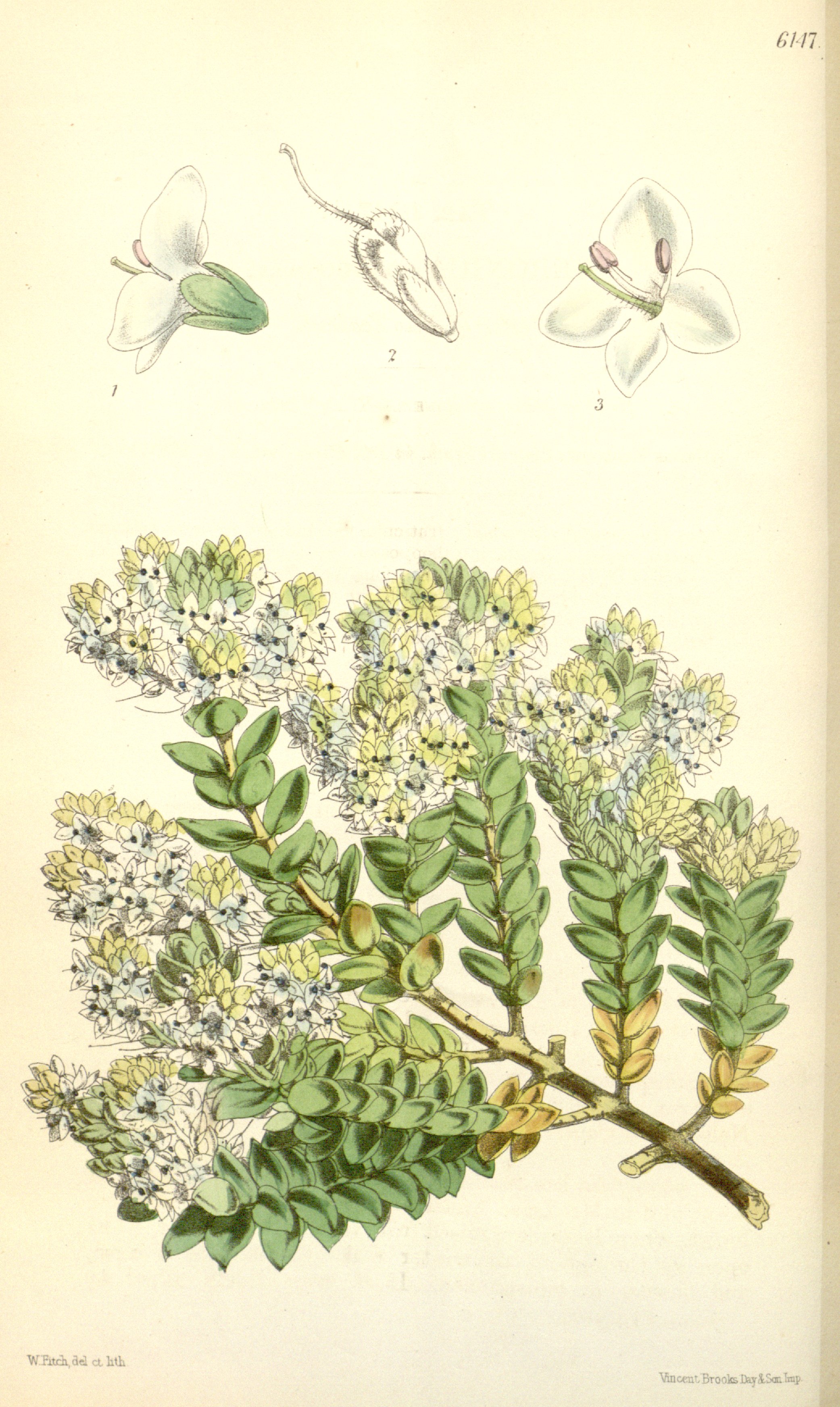 A növényt sokáig Hebe pinguifolia néven kezelték; a Hebe nemzetségnevet a görög ifjúság-istennőről, Hébéről vették át, utalva a növények friss, üde, örökzöld lombjára.
